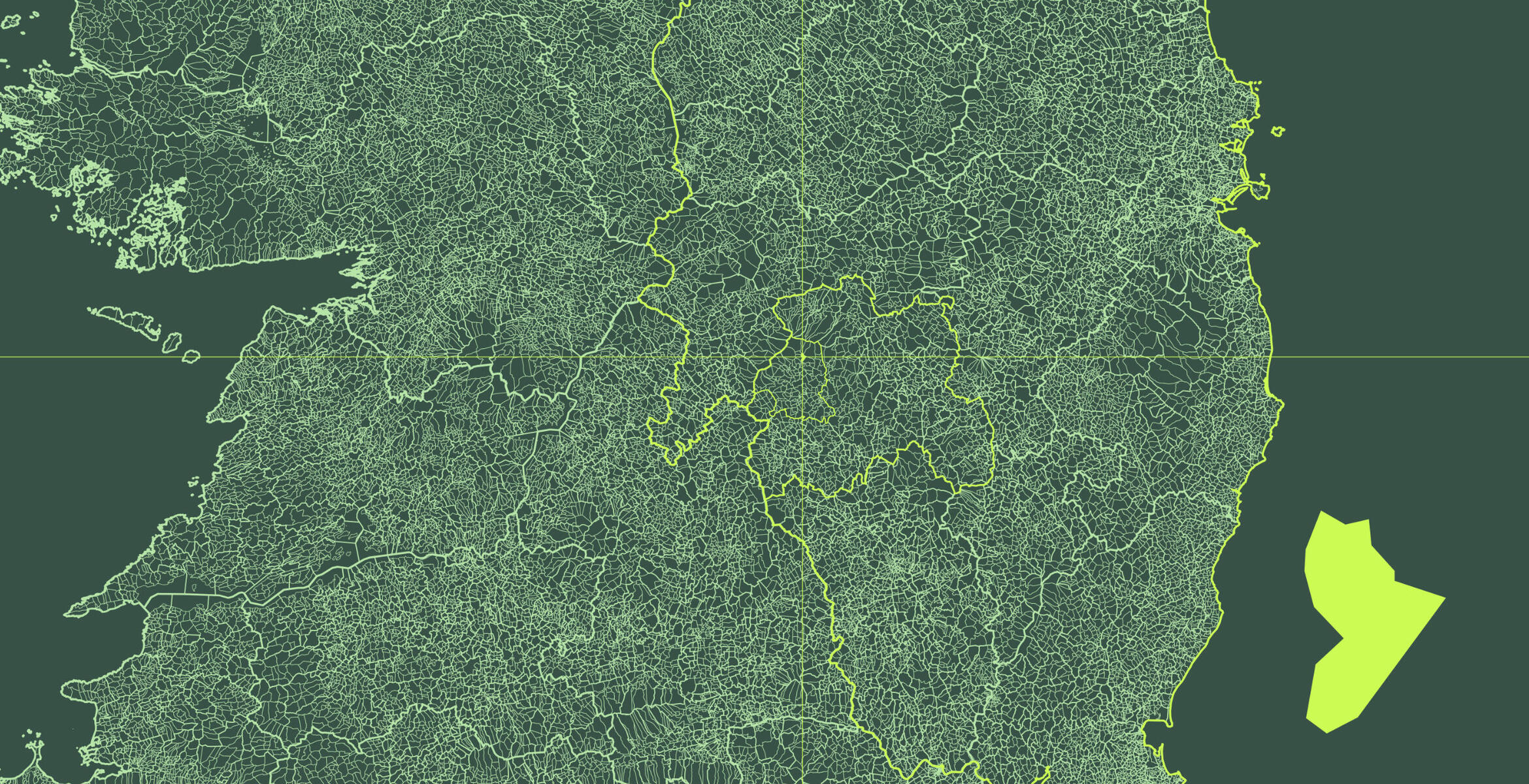 This unique poster not only shows the province, county, barony and civil-parish land divisions, it also reveals the stunning patchwork of all sixty-one thousand townlands on the island of Ireland. With no details other than land boundaries, the poster hints at geography and urban settlements in an unusual and organic way.